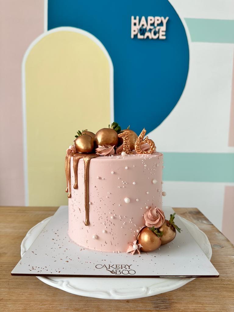 Nuestra encantadora tarta decorada con fresas y drip en tonos rosa y Oro. Diseñada con amor y atención a cada detalle, esta tarta no solo es bonita, ¡también es deliciosa!