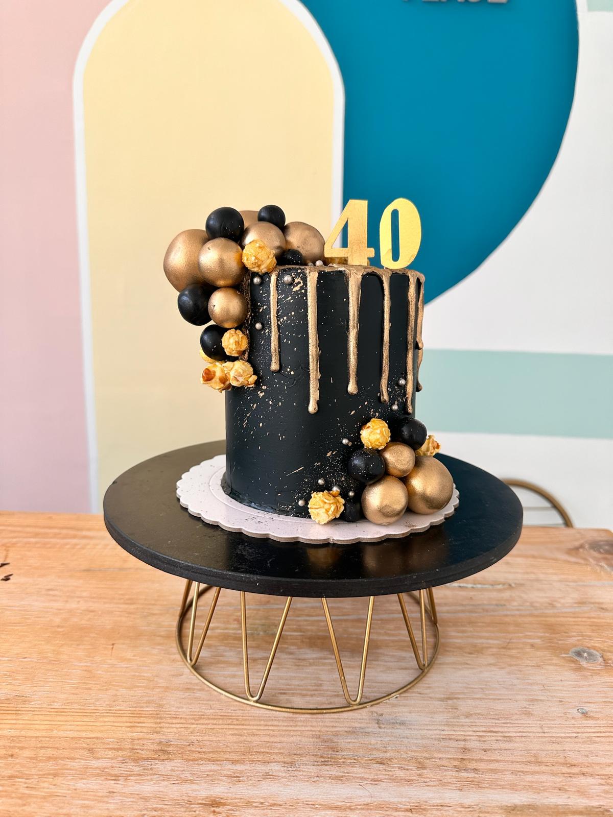 Elegante tarta con drip dorado y bolas de fondant. Todo en negro y dorado.