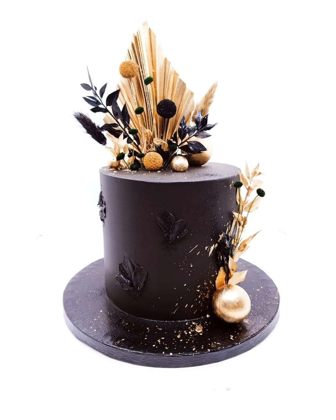 Elegante tarta negra y Oro con detalles de naturaleza seca pintados de Dorado