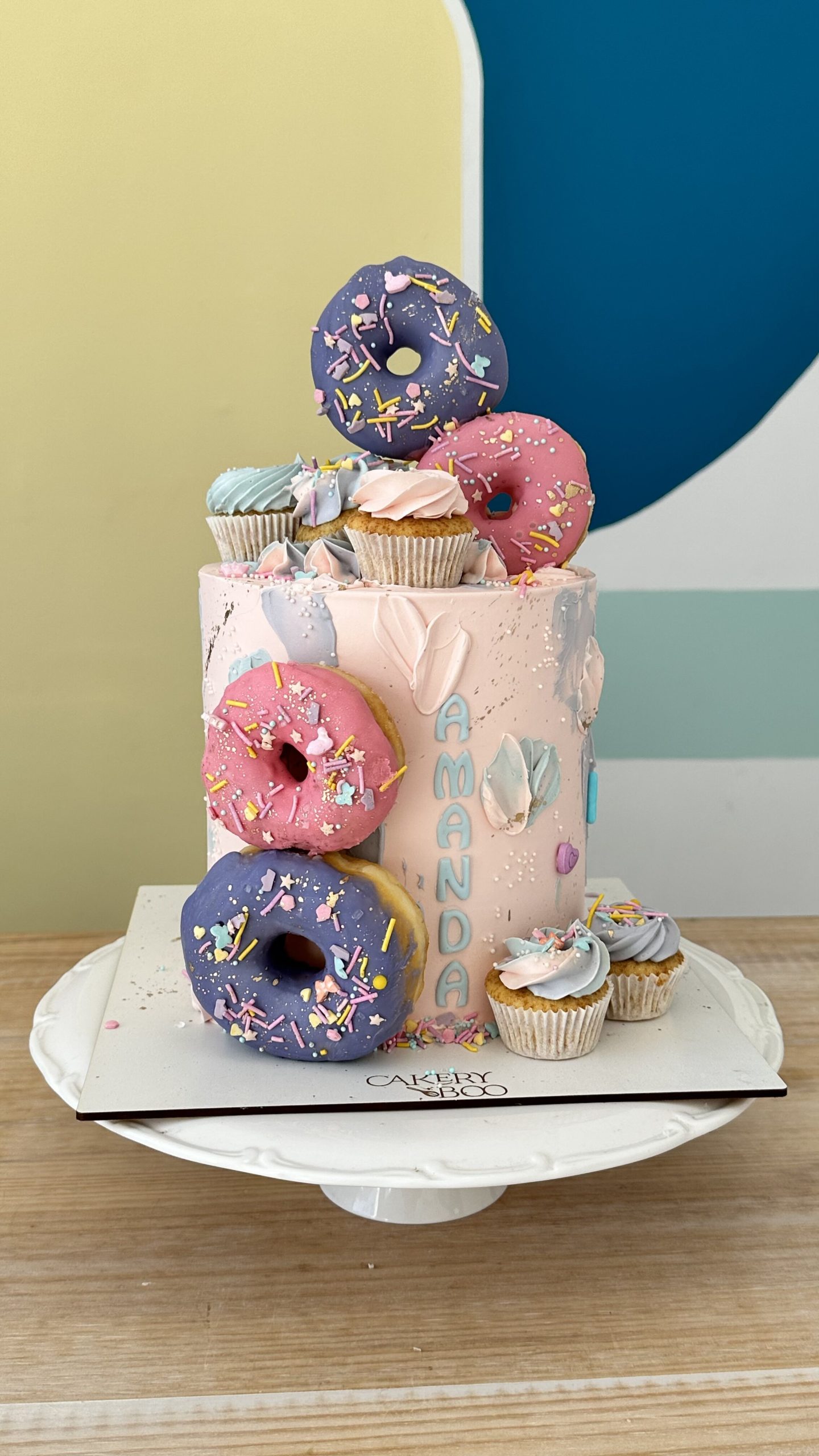 Tarta de Donuts muy colorida y perfecta para tu fiesta de cumpleaños. Nota ** Las fotos son ejemplos de tartas hechas de este estilo, ninguna sera nunca exactam,ente igual a la otra.