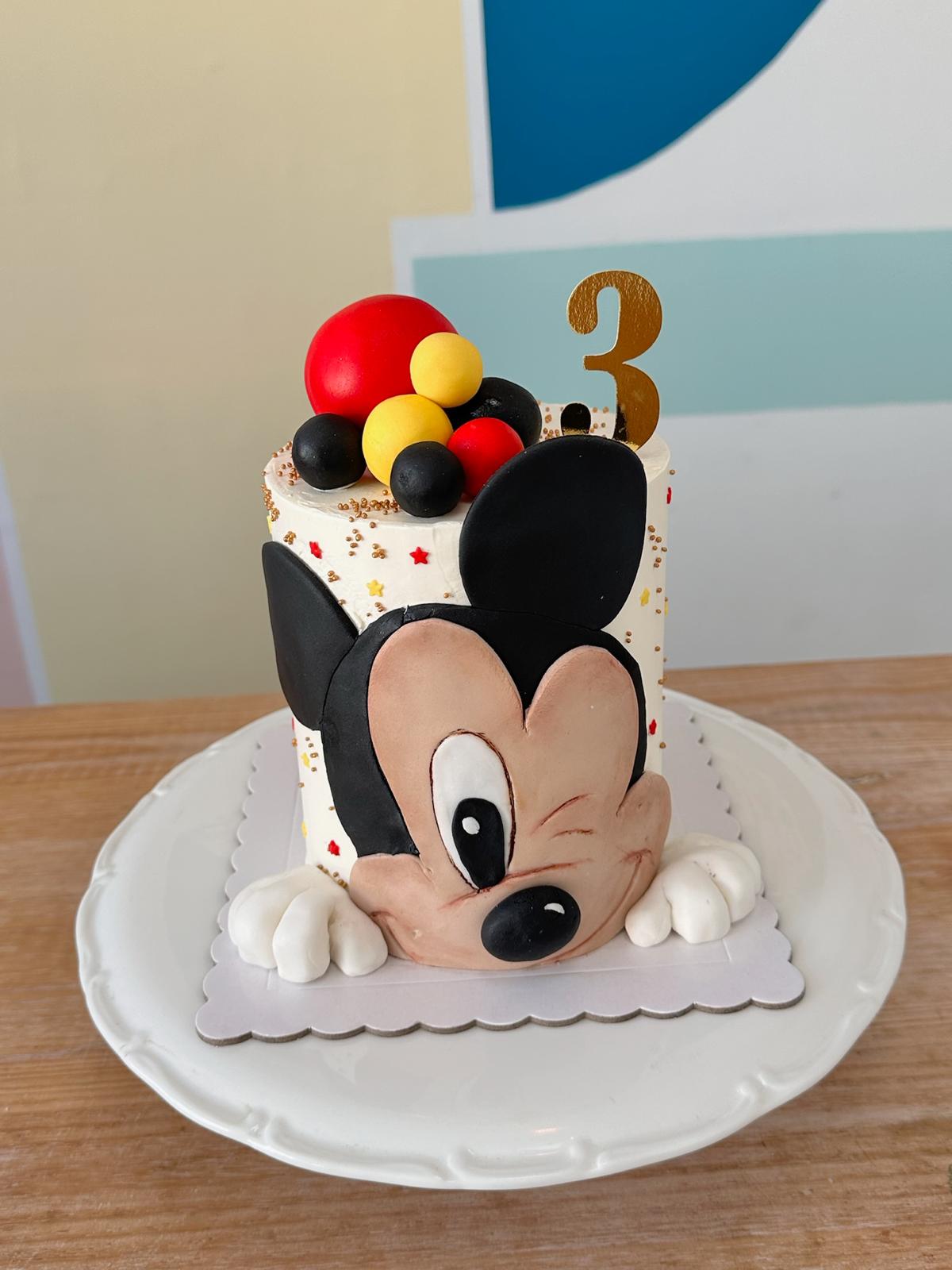 Tartas tematizada de Mickey Mousecon detalles de fondant, papel de azúcart, todo comestible.