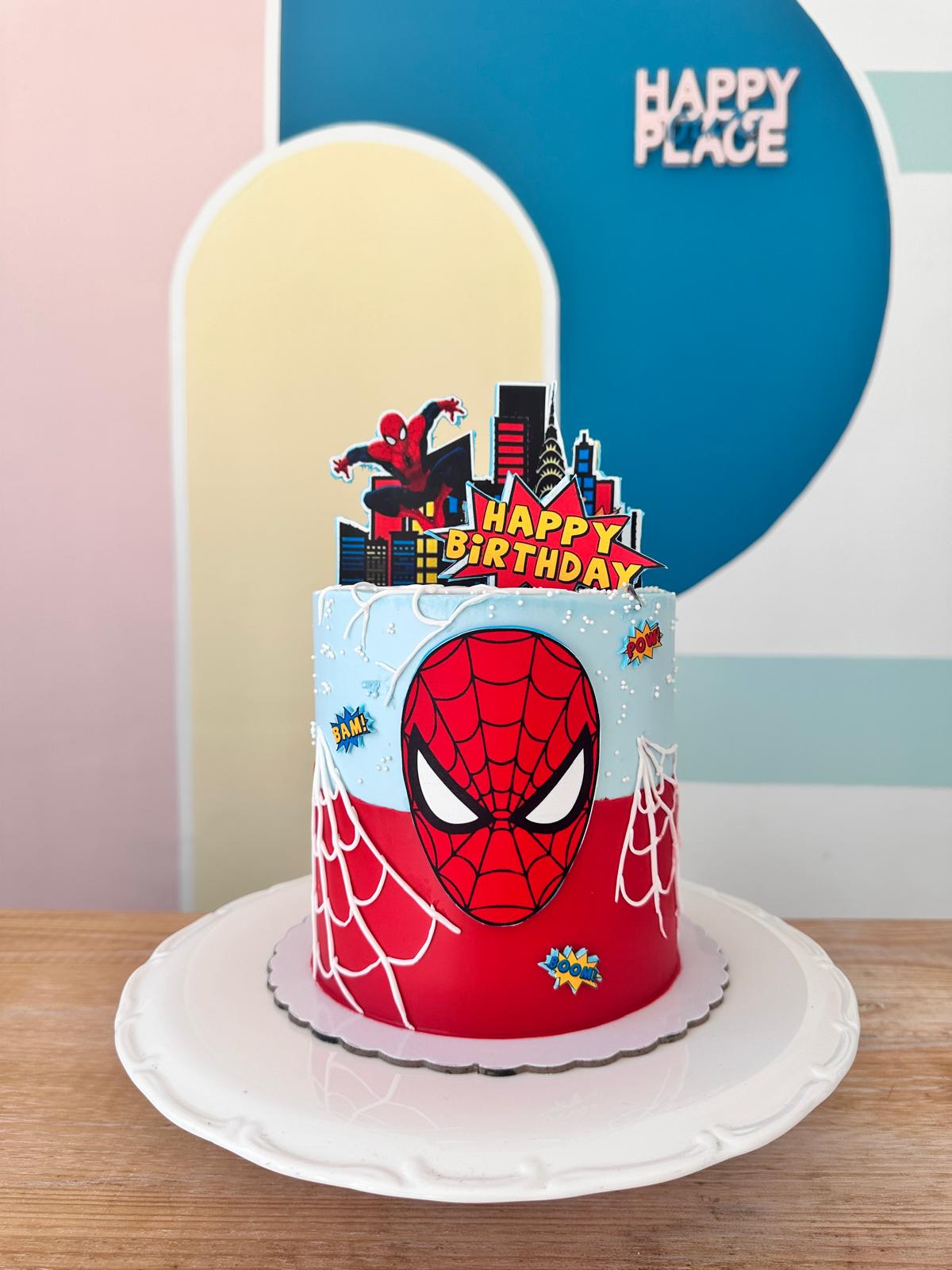Tartas tematizada de Spiderman con detalles de fondant y papel de azúcar, todo comestible.