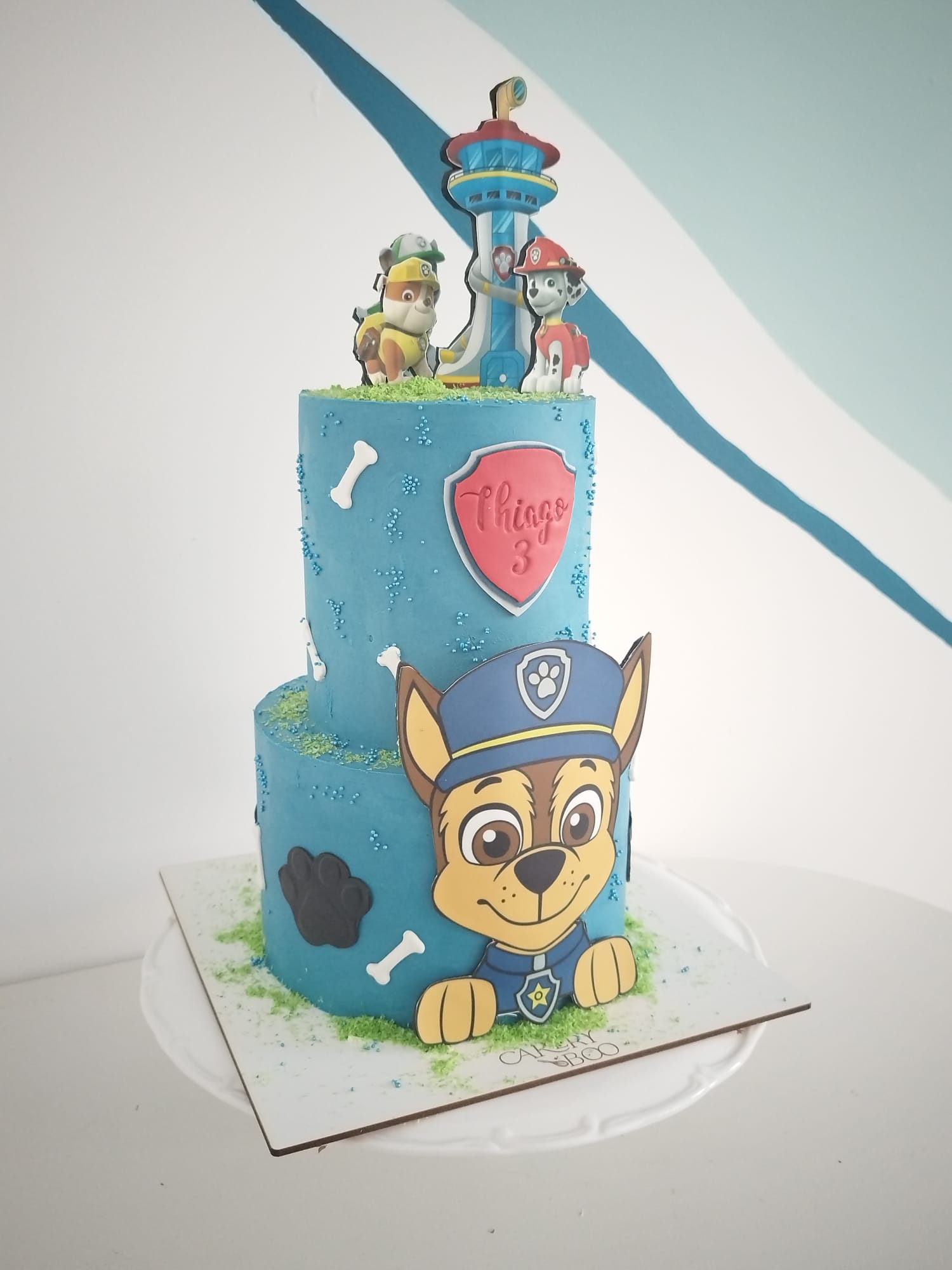 Tartas tematizada de Patrulla canina con detalles de fondant y papel de azúcar, todo comestible.